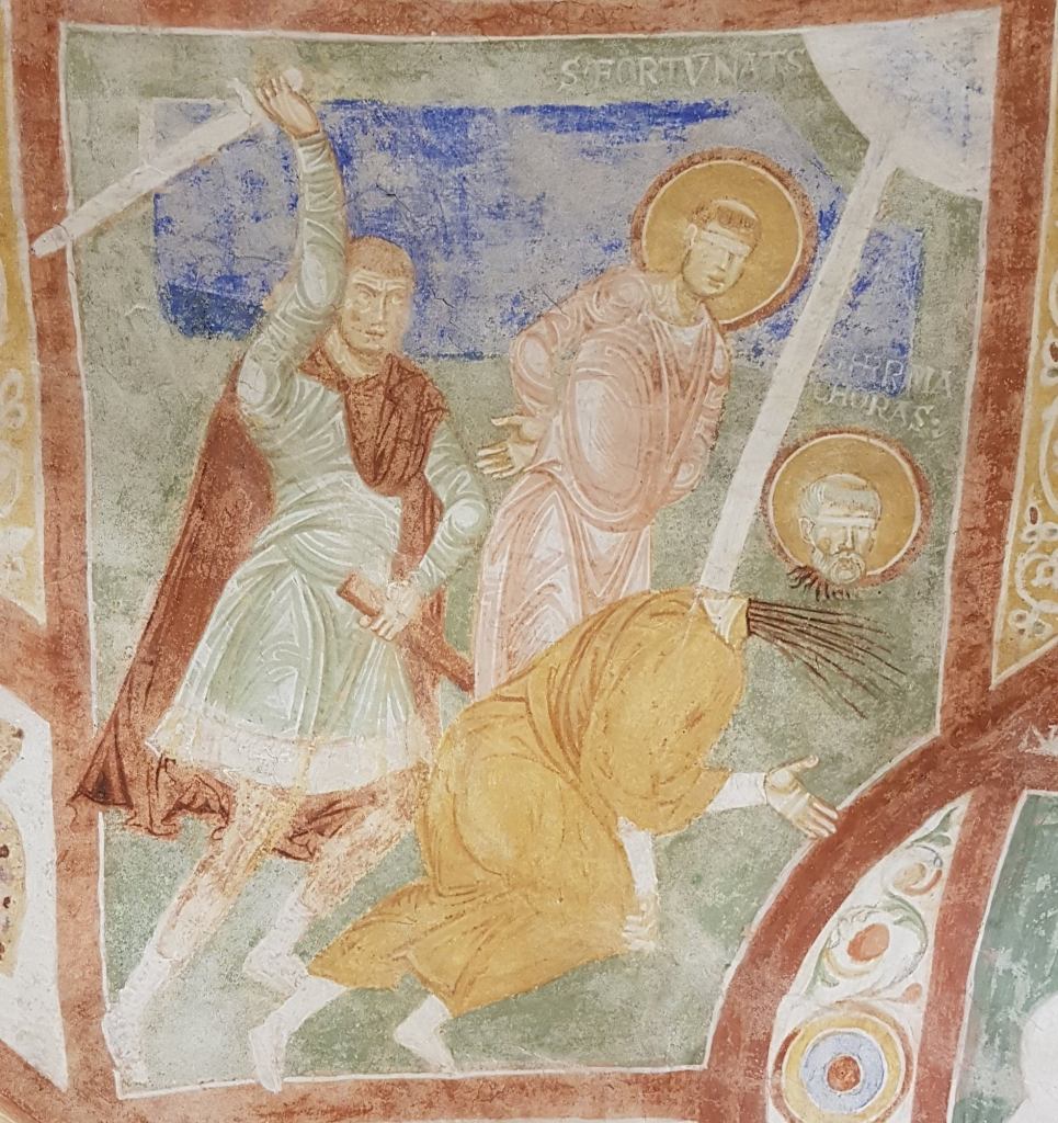 A kripta freskói az első Aquileiai püspök, Hermagoras történetét mesélik el, 20 képen keresztül: Hermagorast Szent Márk küldte Aquileába, ahol keresztelt, prédikált és térített. Később diakónusával, Fortunatussal együtt, a keresztényüldözések alatt mártírhalált haltak. (A képen: Szent Márk bemutatja Hermagorast az Aquileiaknak.)