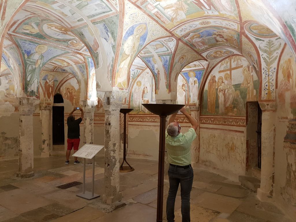 A kripta belülről, a képen nem vallási szertartást látunk, csak a freskókat fotózzák a turisták.