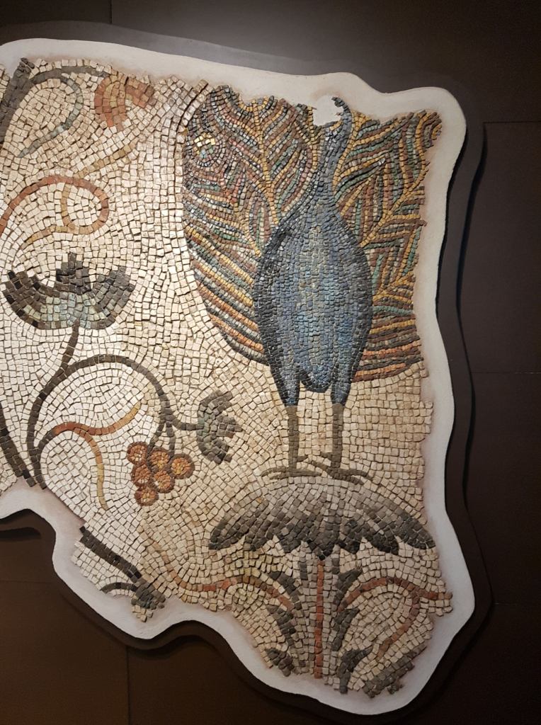 A kék páva ábrázolása. A pogány kultúrában a jó szerencse jelképe volt, a keresztény közösség számára a feltámadást és az örökkévalóságot jelképezi a szakrális épület padlóján.