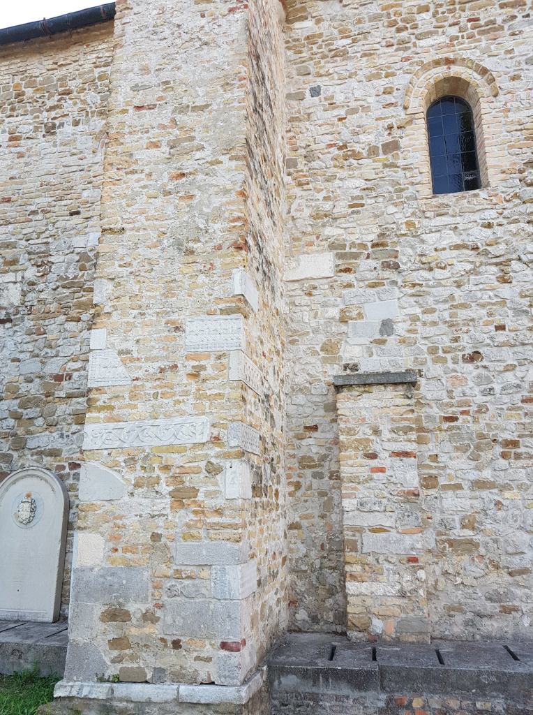 A római köveket is felhasználták az Aquileai bazilika építésénél. Bár lehet, hogy a támfalakat később építették, bennük feltűnően sok az “újrahasznosított”, faragott kő.