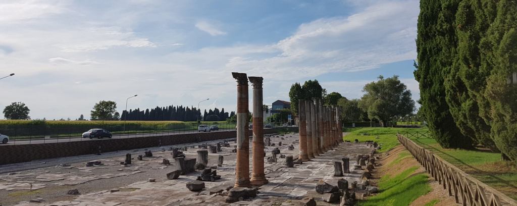 Aquileia már a rómaiak idején fontos kikötő és város. Az egyik első- és legfontosabb keresztény központ. Az oszlopok a fórumra (piactérre) emlékeztetnek. Az egykori teret kettévágta az autóút.
