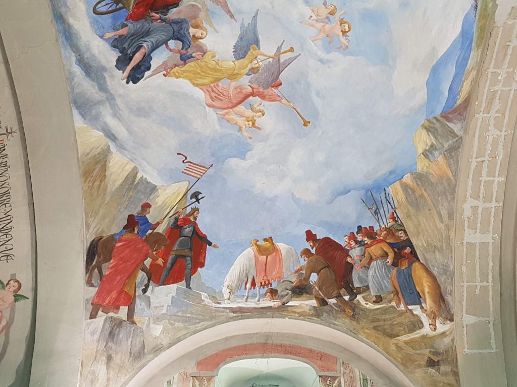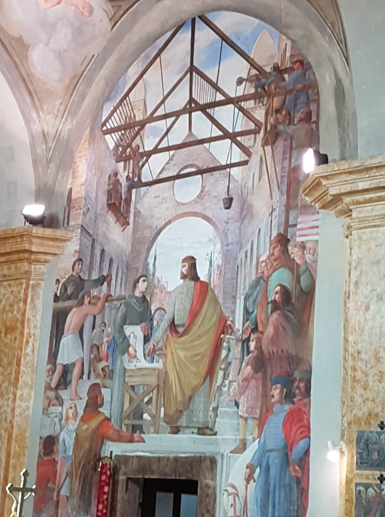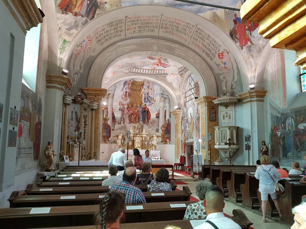 A templom freskóit Jeges Ernő készítette 1953-ban.Érdekes és sokatmondó a dátum. 1953. július 1. szerepel az aláírás mellett. Amikor a rákosista diktatúra első éveinek szörnyűségeit követően megszületik a remény, hogy Nagy Imre vezetésével új kormány alakulhat…A képeken a magyar középkort, a Szent királyok nemzetségének alakjait festette meg. A falakon láthatjuk a katedrálist építő Szent Istvánt, Szent Imre herceget, a tordai hasadékot átugró lovagkirály, Szent László alakját, vagy Szent Erzsébetet, Szent Margitot. A falubeliek szerint a mellékszereplők között a gyülekezet egykori tagjaira is ráismerhetünk.