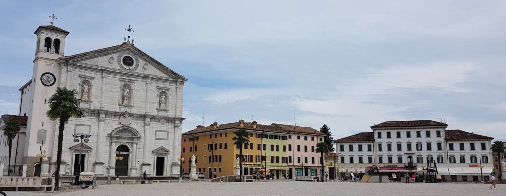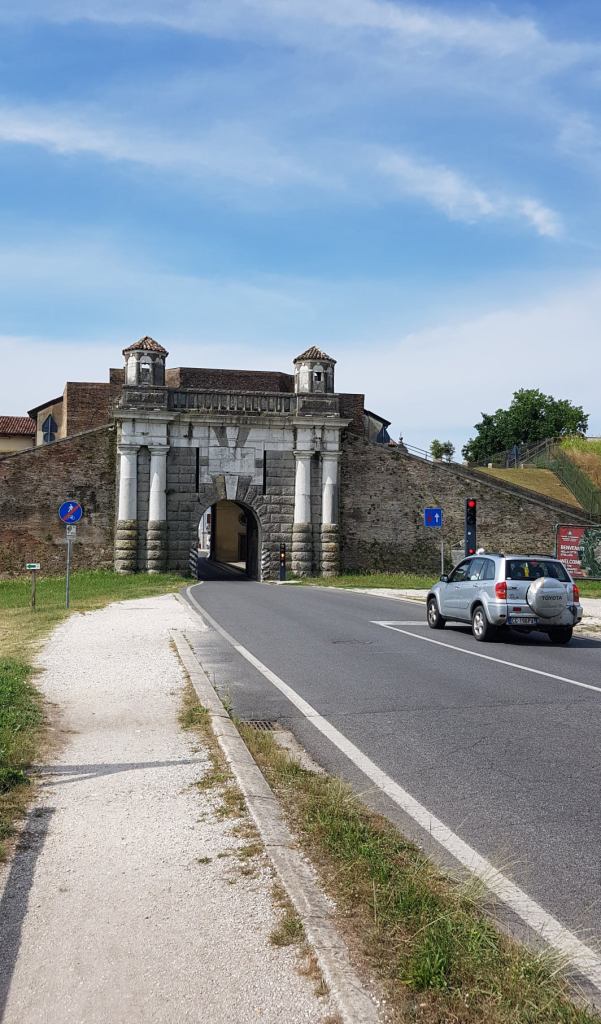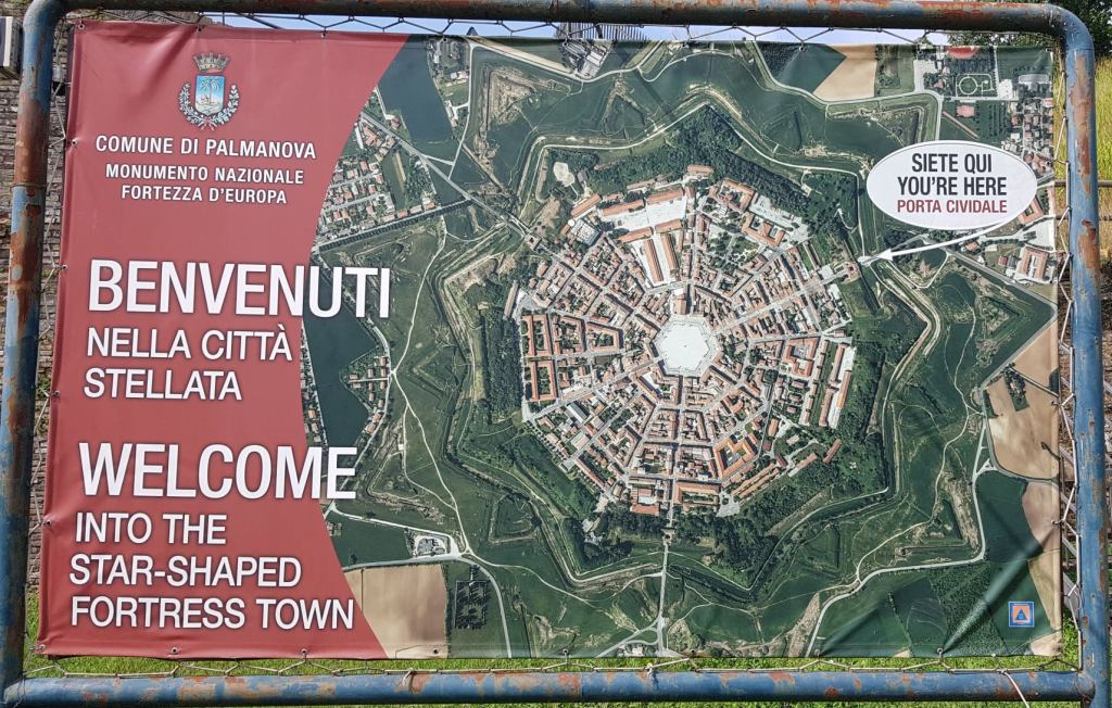 A komáromi monostori erődhöz hasonló látvány fogad bennünket Palmanova kapujánál. Csak itt egy egész város rejtőzködik az erőd falai mögött. Három szűk kapun keresztül lehet az autókkal ki és be közlekedni.