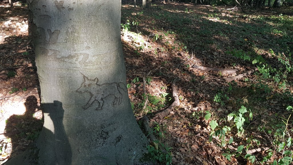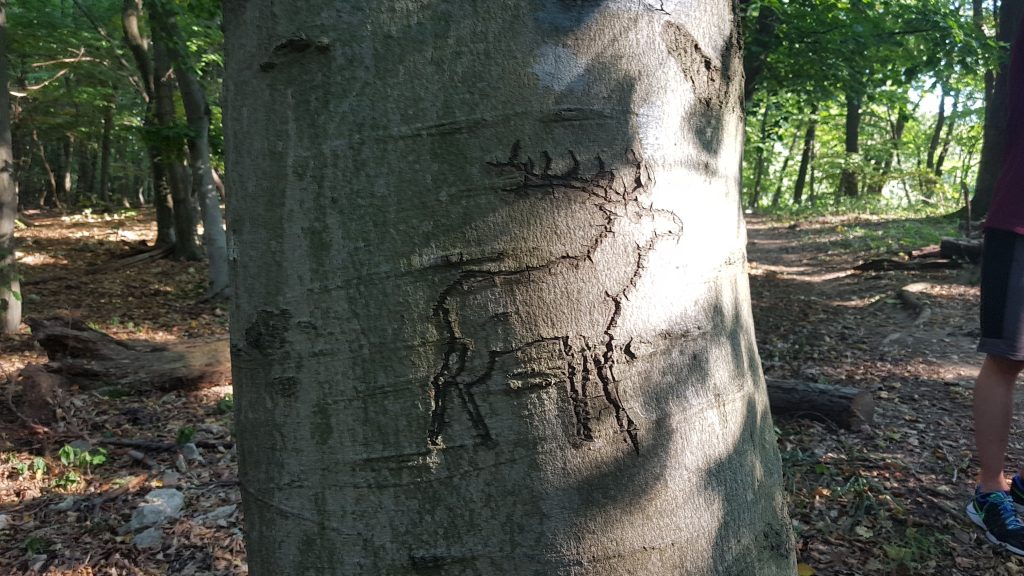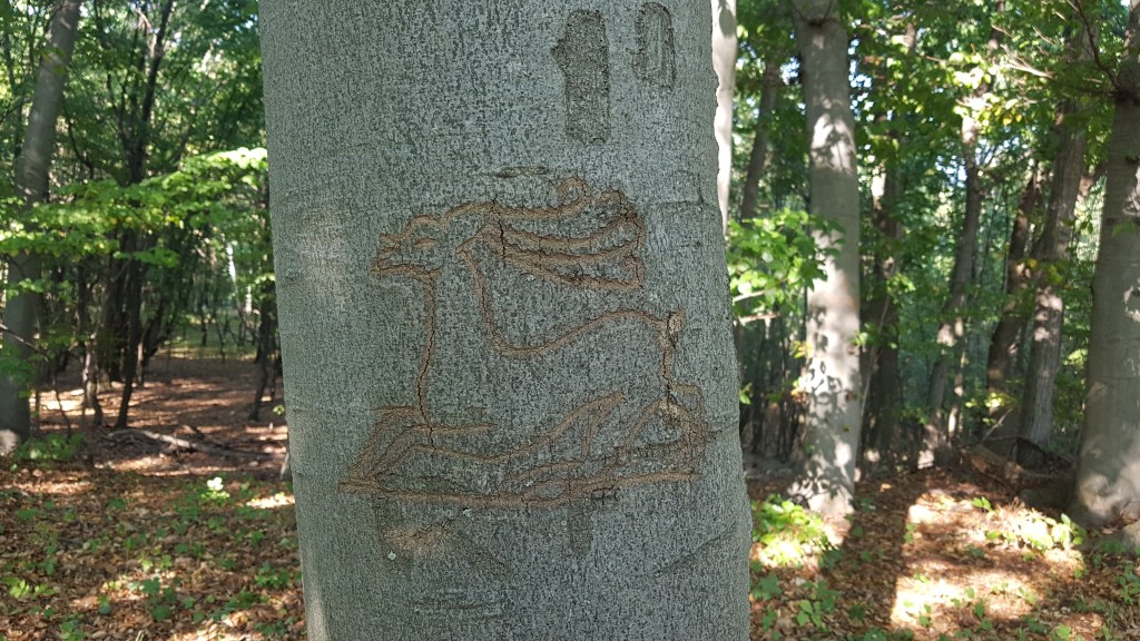 Fotók: (Különös és a kirándulókat is bizonyára megosztó “kiállítás” látható a Vértesben. A fák kérgébe számos állatot karcolt valaki, amelyek akár a Nagy Lajos kori vadászatokat is megidézhetik. A fák méretének növekedésével a fába “rajzolt” állatok is folyamatosan változnak. Ha így nézzük, akár műalkotások is lehetnek, ha úgy, akkor tarthatjuk rongálásnak is. Azt gondolom, hogy a közel évszázados fákra érdemes vigyázni, még a kérgükben sem ejteni sebet. A művészi célra pedig bárki ültethet fát a kertjében, csak győzze kivárni a közel 100 évet, amíg karistolni lehet a kérgében…)