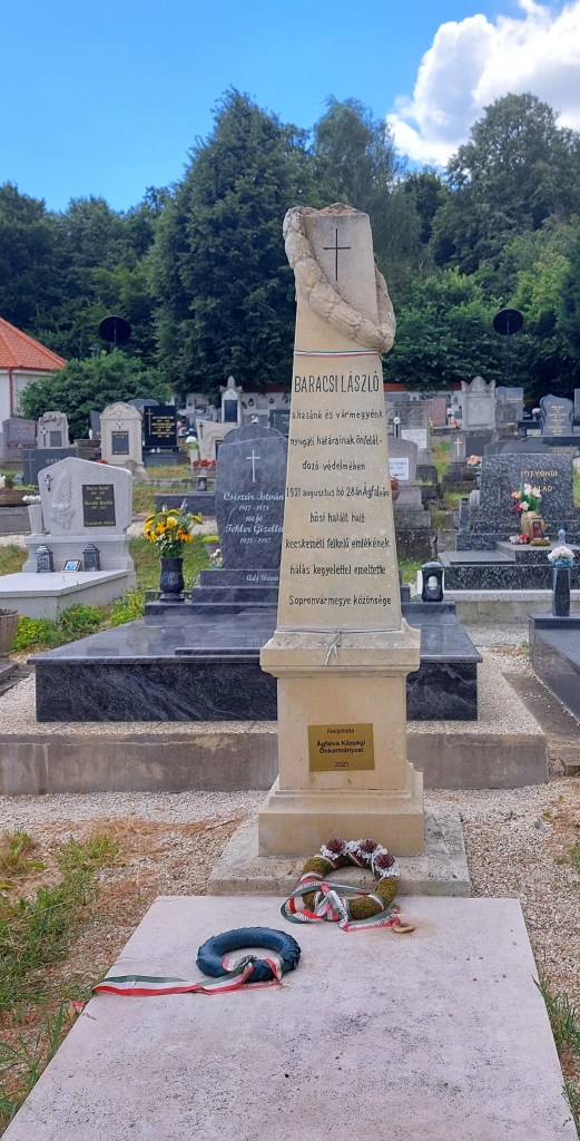 Az emlékművel szemben egy tábla jelzi a két kilométerre fekvő schattendorfi határátkelőt. A településen tovább utazva a hegy felé, a temetőbe mentünk, ahol megkoszorúztuk Baracsi László sírját, amelyet három éve az Önkormányzat újított fel.