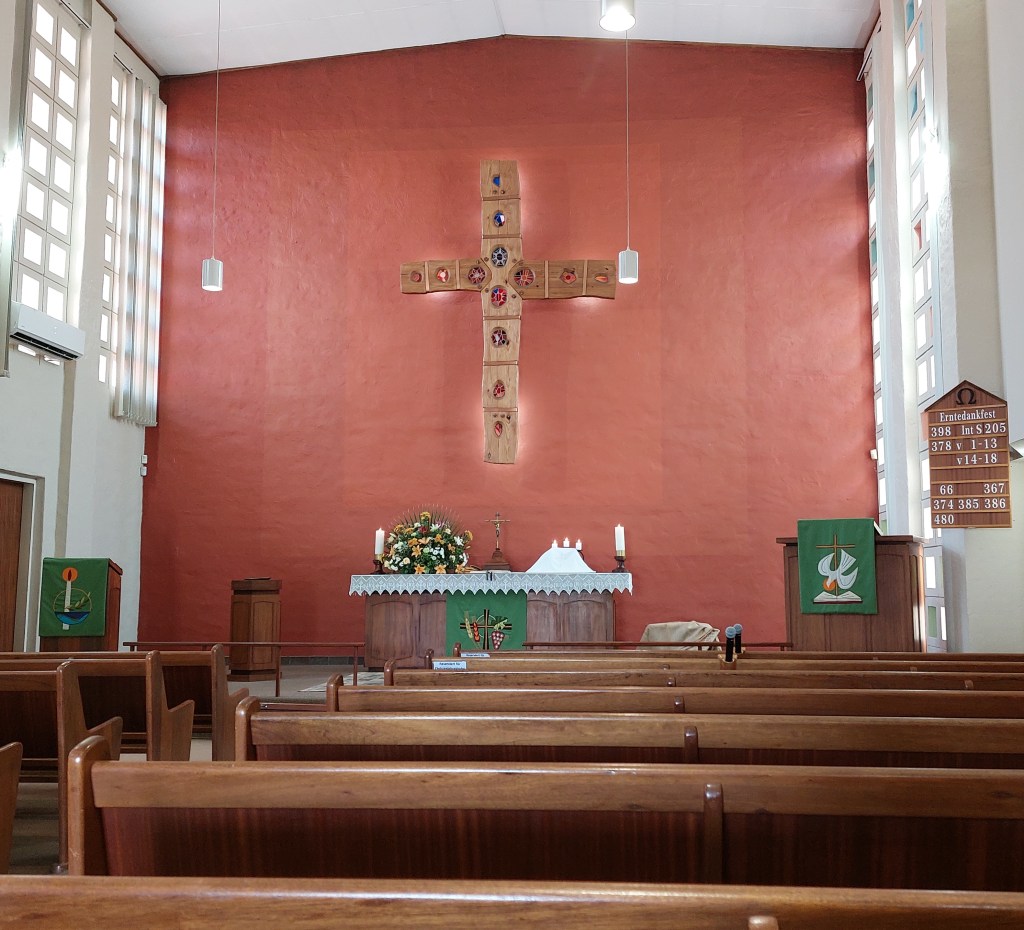 9 órára megyek a németajkú evangélikus templomba istentiszteletre. 8.45-kor már sokan gyülekeznek. A templom, teljesen megtelt, közel 200 ember, főként családok és nagyon sok kisgyermek vesz részt az istentiszteleten. A gyerekek is ingben, öltönyben készültek az ünnepre. Úrvacsorás alkalom kezdődik Erntedankfest, azaz szüreti hálaadás alkalmából. A gyermekkórus után kezdődik az evangélikus liturgia, szép, ünnepélyes. Egy dolog, az istentisztelet végén azonban más, mint nálunk, itt egy mini bibliaóra zárja az istentiszteletet, amikor a lelkész a gyerekeket kikérdezi az addig tanultakról. Az első padokban ülnek a 6-10 éves gyerekek és majd kiesnek a padból, hogy őket szólítsák fel. Mikrofonba kell mondani a választ, a lelkész kérdéseire. Szép, ünnepélyes formában nem csak a gyerekek adnak számot a tudásukról, hanem a gyülekezet is átizgulhatja ezt a néhány percet, és természetesen át is ismételheti az egykor tanultakat.