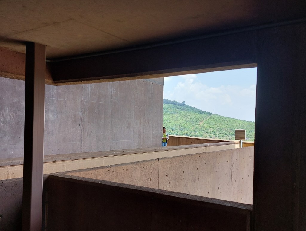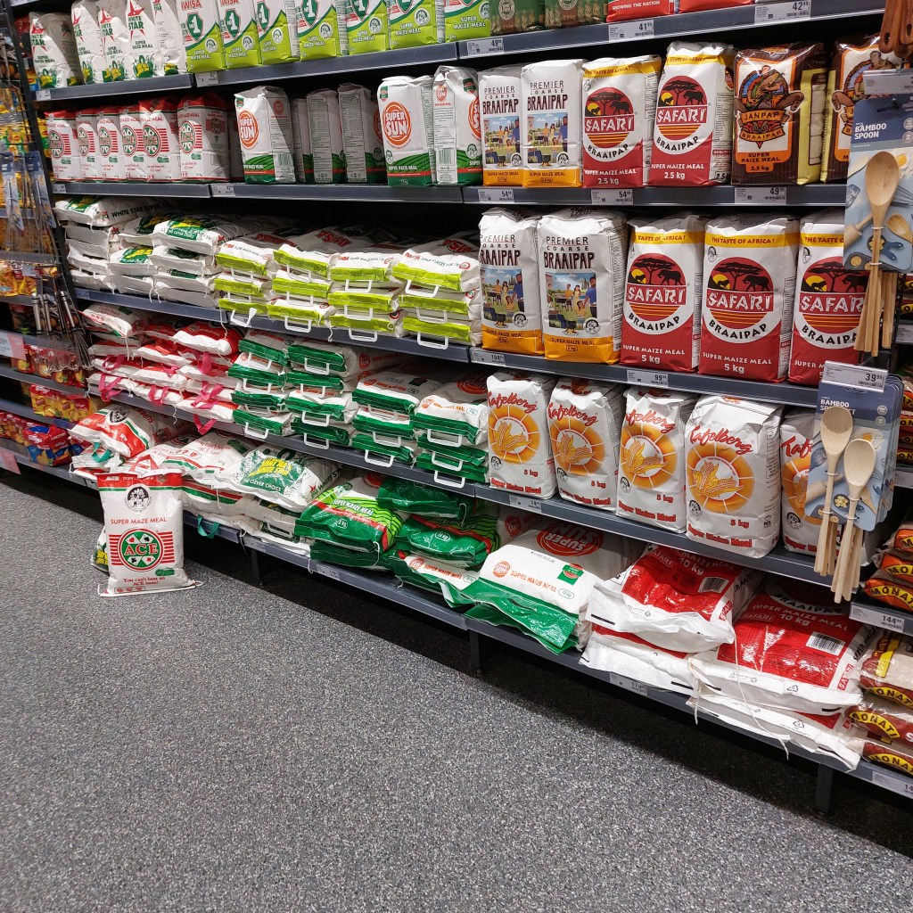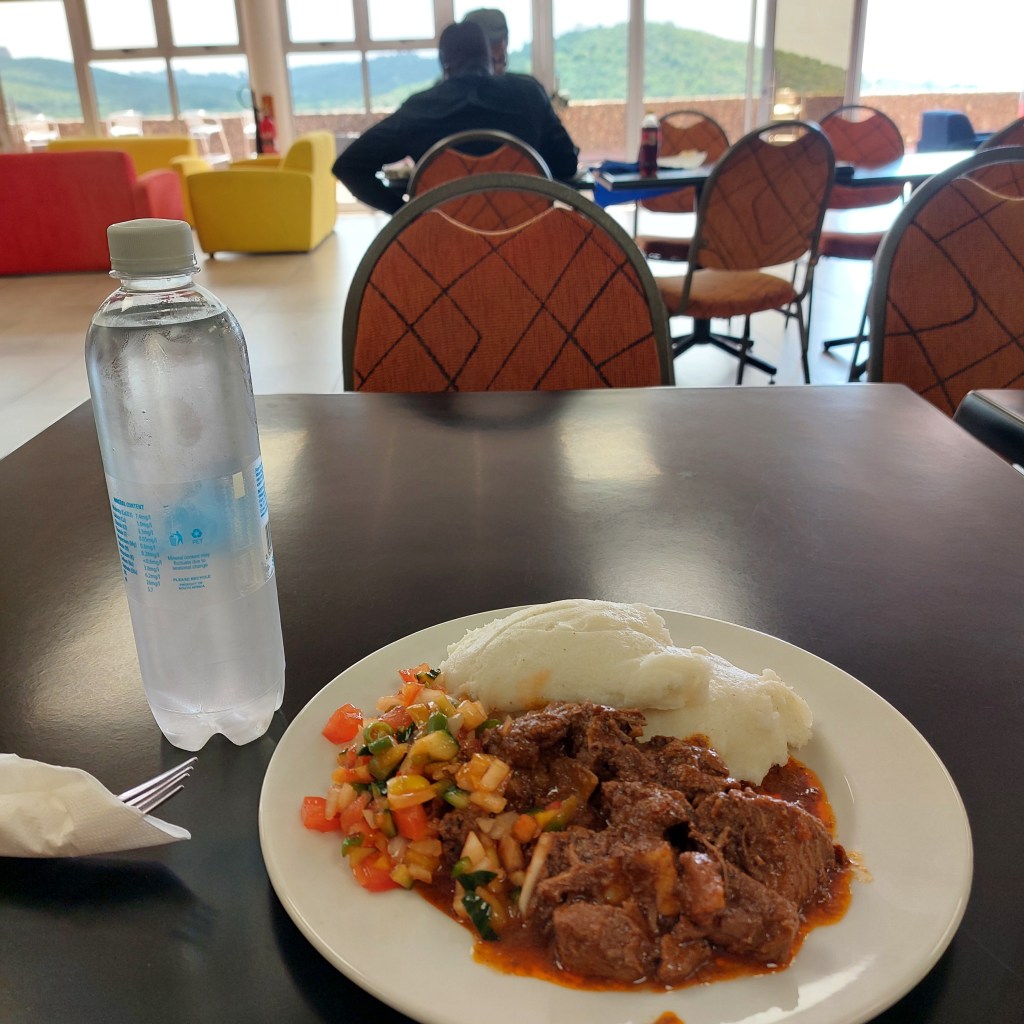 A második tál marhapörkölt mellé pedig a Dél-Afrikában legjellegzetesebb köret, a mieliepap, azaz kukoricakása került. Ez olyan népszerű, hogy a boltokban a rizs mellett 5-10 kg-os zsákokban lehet vásárolni hozzá az alapanyagot. Remekül passzol a marhapörkölthöz. Ahogy a képen is látható jár még hozzá egy kis saláta, ami kellemes savanyúságként kíséri a csonttal főzött marhahúst. A köretben van uborka, sárgarépa, káposzta és nagyon fontos: zöld friss erőspaprika, amit az egyetem balkonládáiban termesztenek és frissen szüretelik tálalás előtt. Mindez 72 randba, azaz 1400 magyar forintba kerül.