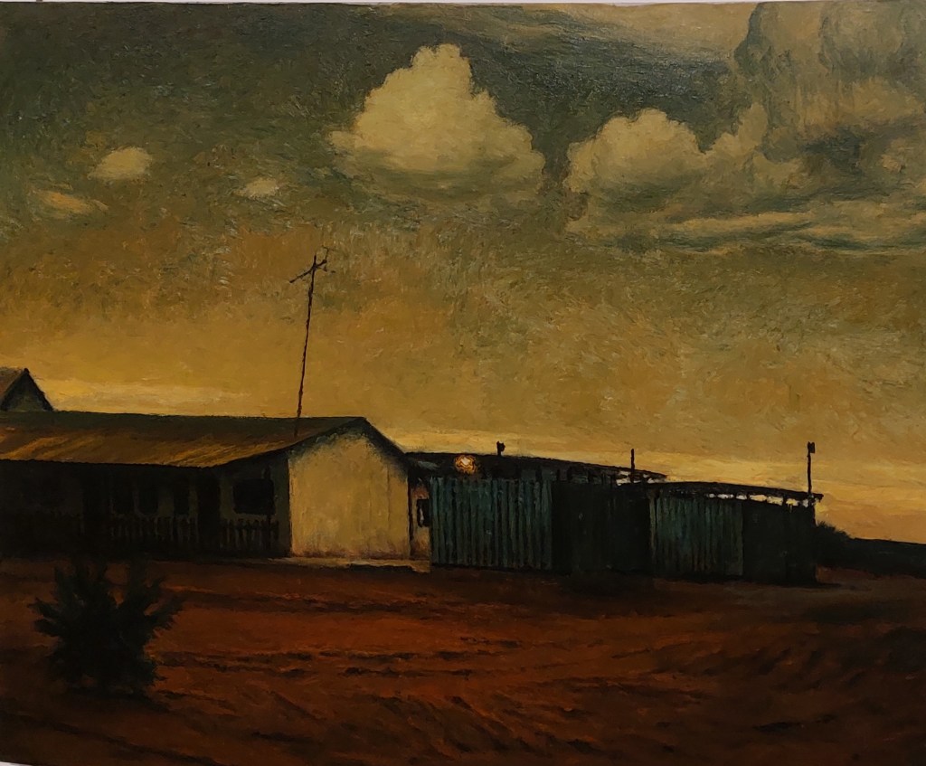 Egyik személyes kedvencem következik. Dél-Afrikáról sokat elárul a következő kép, melynek címe: Tv szoba, bár és zuhanyozó. Amint megérkeztek a nyugati telepesek, nem sokat törődtek azzal, hogy a bányásztelepeket milyen építészeti megoldásokkal alakítják ki. Sok helyen találkozni még ma is hasonló jellegtelen épületekkel. De a festő színei, a fények játéka mutatja igazán milyen különös természeti adottságú helyeken is jöttek létre ilyen és hasonló telepek.
